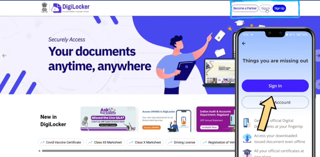 - On PC: Visit the official DigiLocker website and click “Sign In”.